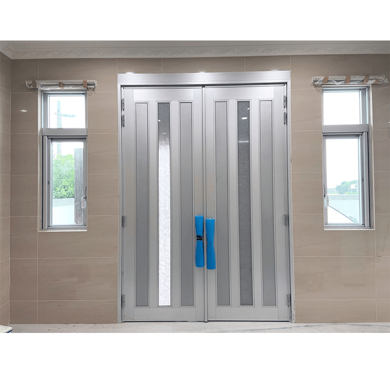 鋁合金氣密門併氣密窗搭配下木紋轉印鋁板,展現大器美感。
